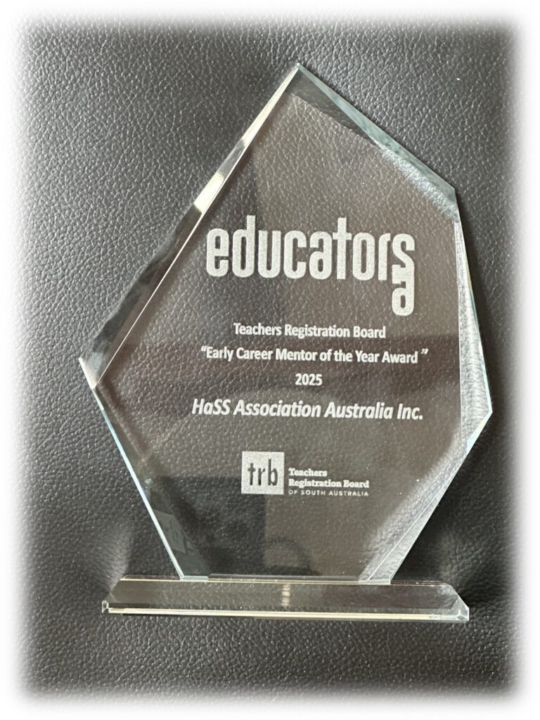 At the 2025 Educators SA World Teachers Day Ceremony at Adelaide Oval, HaSS Association Australia was presented with the Teachers Registration Board Early Career Mentor of the Year Award for 2025. The citation read: HAA have made an outstanding contribution to the early career educators in our State. As a team they initiated the HAA Mentor programme and it has resulted in a membership base of several hundred HASS educators, where 50% of those members are pre-service educators and 25% are early career educators. They achieved this through innovative approaches to linking the wisdom and expertise of the profession into a mentoring programme designed by the mentees themselves. Their regular, innovative, industry-connected, Tribrid professional learning model has generated passion and teaching practices that will impact on learners for many years to come. Their success was no more evident than at the recent Flinders University Expo, where their pre-service and early career Committee Members were a joy to watch as they powerfully connected, welcomed and supported the new cohort of University students to our profession.