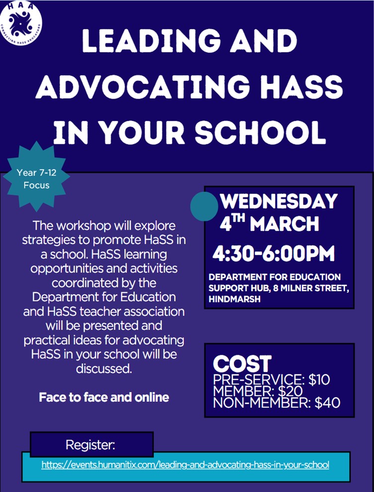 1. Leading and advocating HaSS in your school – Wednesday 4 March, 4.30 – 6.00pm – Department for Education Support Hub conference room, 8 Milner Street, Hindmarsh