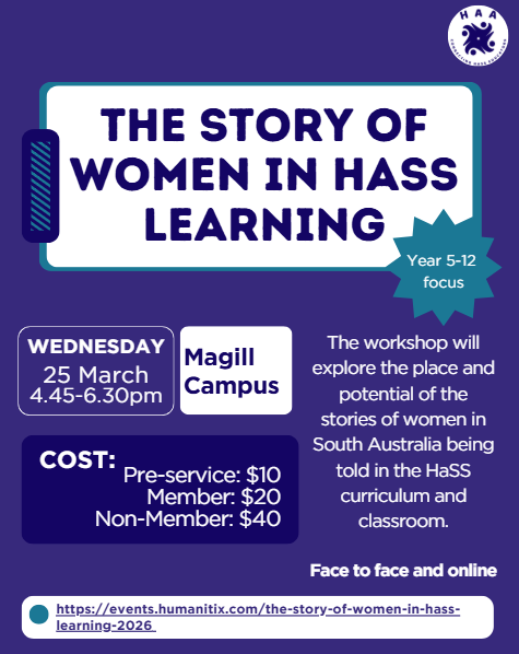 1. The Story of women in HaSS learning workshop was conducted online and face-to-face from 4.30 – 6.00pm at St Mary’s College. In collaboration with the Women’s Studies Teachers Association of South Australia, the workshop explored women’s studies in the HaSS curriculum and classroom. A resource will be launched in the near future relating to this workshop.