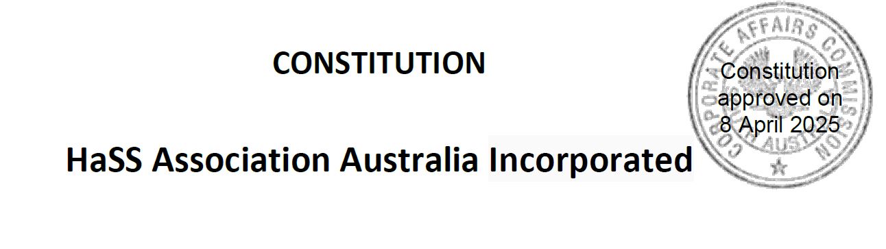HaSS Association Australia is an Incorporated not-for-profit organisation. The HaSS Association Australia Incorporated Constitution was approved by South Australian Consumer and Business Services in the Attorney-General’s Department on 18 October 2023 (Incorporation number 18443830). The HAA Constitution was recently updated and approved by the South Australian Department of Consumer and Business Services on 8 April 2025. The current approved HAA constitution is attached.